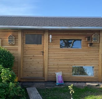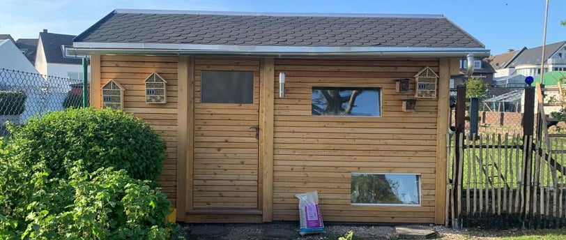 Ein Hühnerhaus sollte nicht nur funktional, sondern auch optisch ansprechend sein. Für dieses Projekt haben wir ein Hühnerhaus im Holzrahmenbau mit einer modernen Rombus-Fassade ausgestattet, die nicht nur schön aussieht, sondern auch langlebig und pflegeleicht ist. Die charakteristischen, schräg verlegten Holzpaneele der Rombus-Fassade verleihen dem Gebäude eine elegante und zugleich rustikale Ausstrahlung, die perfekt in jeden Garten passt.
